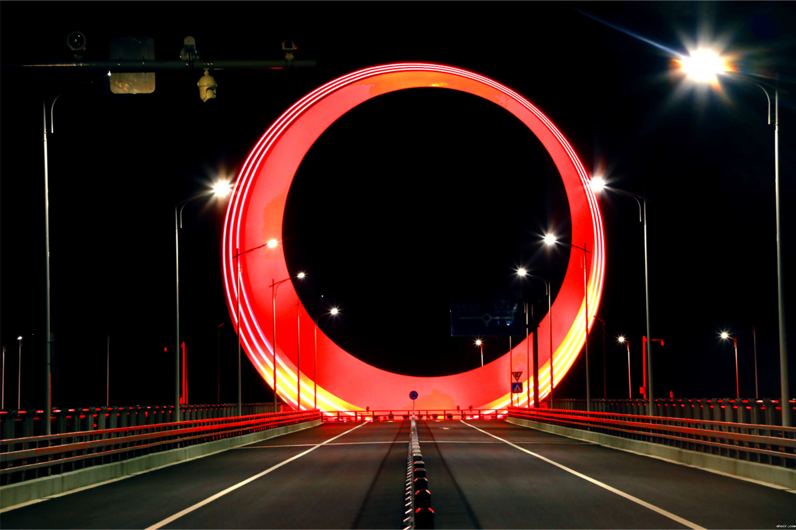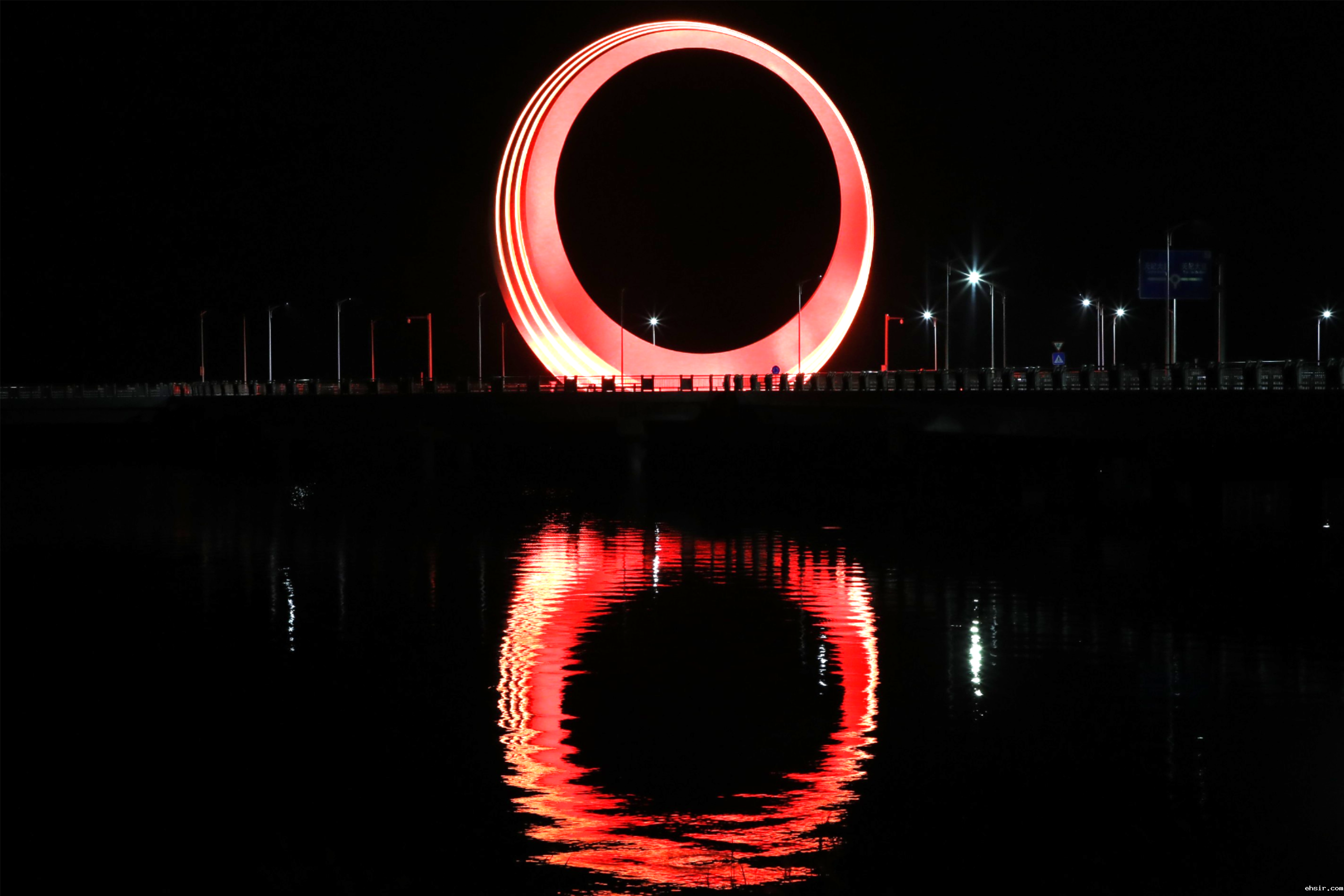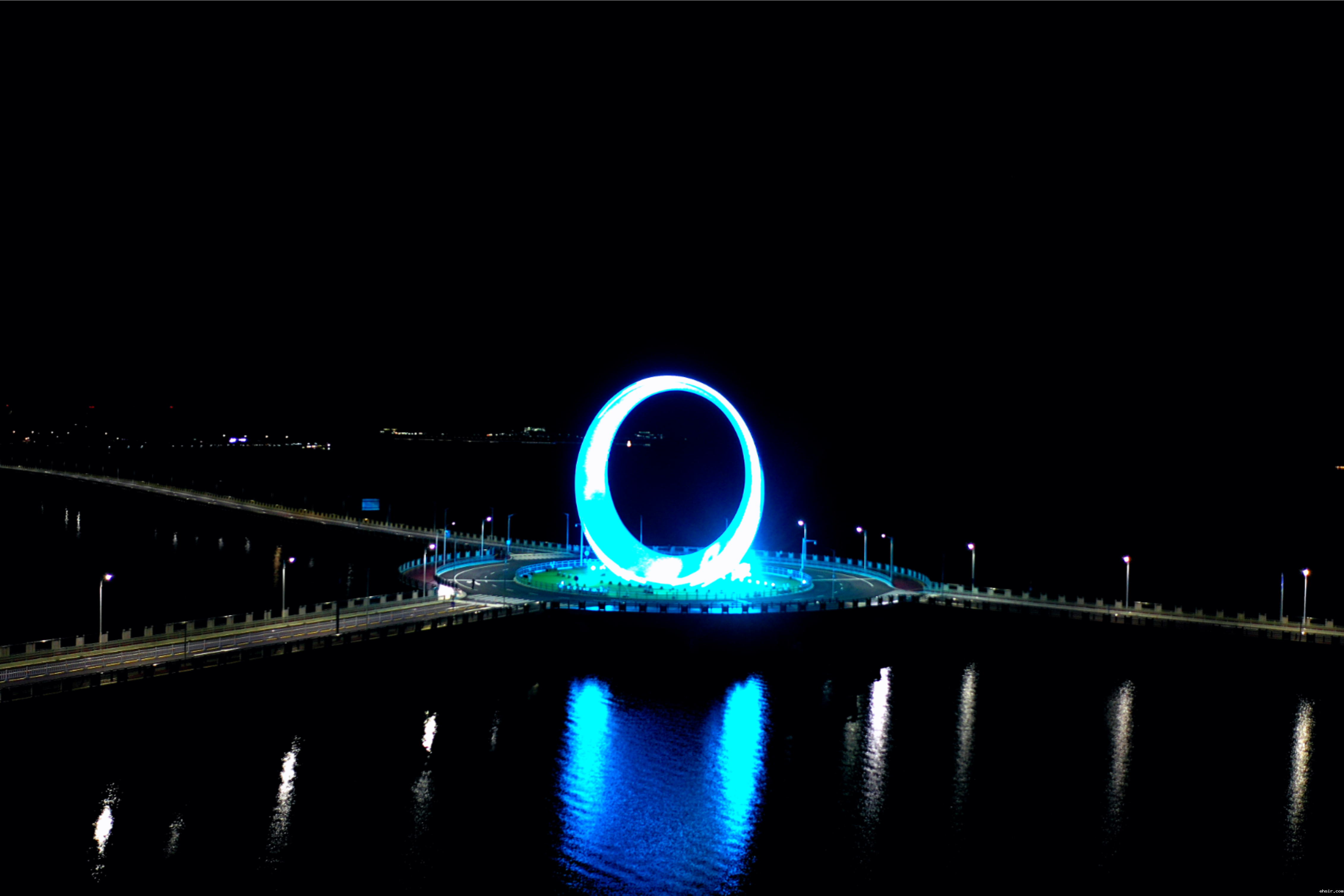 该桥位于宁波湾省级旅游度假区,长1903米,采用环形交叉口形式连接173米长的狮山路跨海大桥。在环形交叉口中间,项目团队打造了独特景观雕塑——“海上生明月”(又名生命之环、天妃之戒)。雕塑由内而外逐渐三圆辐射,寓意三生万物,体现奉化通过融合与虹吸,生生不息,不断发展。其中,雕塑外环直径36米,内环28.7米,夜景通过艺术灯光营造,形成魅力奉化之夜明珠。未来,狮岭路与天妃大道正式开通后,“海上生明月”景观雕塑将成为宁波市新的网红打卡地。
